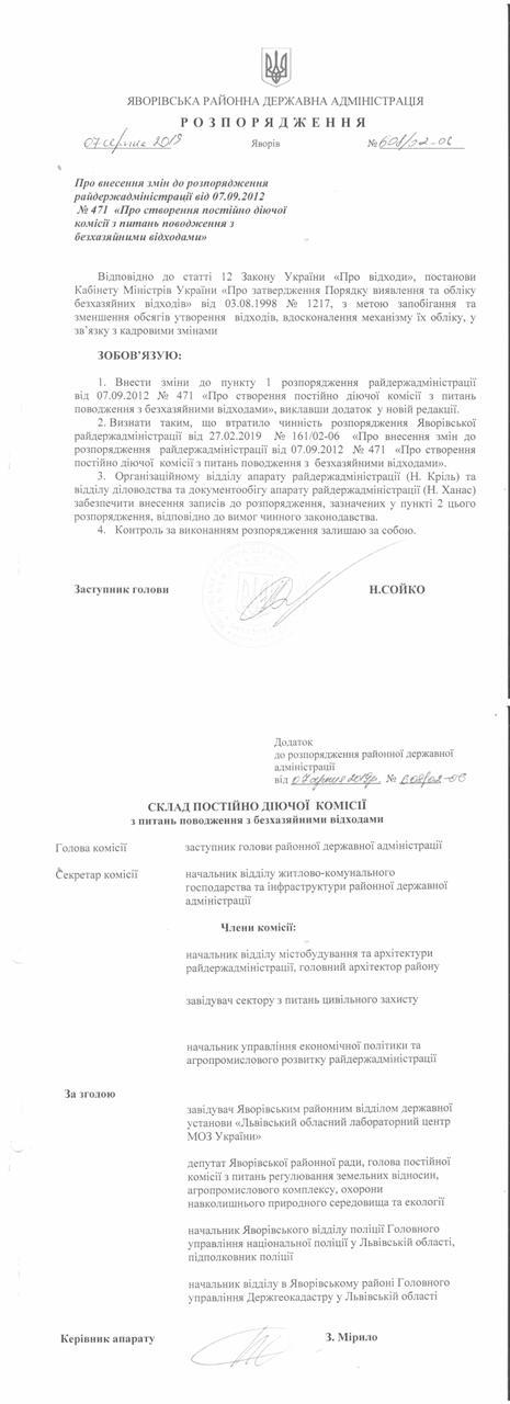 №608/02-06 2019-08-12 Про внесення змін до розпорядження райдержаадміністрації від 07.09.2012 року № 471 " Про створення постійно діючої комісії з питань поводження з безхазяйними відходами"