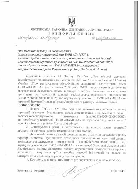 №614/02-06 2019-08-13 Про надання дозволу на виготовлення детального плану території для ТзОВ "ЛАМЕЛА" з метою будівництва складських приміщень на земельній ділянці несільськогосподарського приміщення (к.н.4625884500:08:000:0002), що перебуває у ласності ТзОВ "ЛАМЕЛА" на території Залузької сільської ради Яворівського району Львівської області