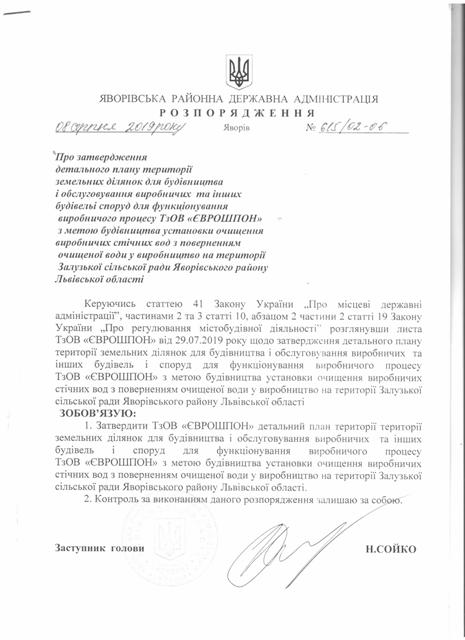 №615/02-06 2019-08-13 Про затвердження детального плану території земельних ділянок для будівництва і обслуговування виробничих та інших будівель і споруд для функціонування виробничого процесу ТзОВ "ЄВРОШПОН" з метою будівництва установки очищення виробничих стічних вод з поверненням очищеної води у виробництво на території Залузької сільської ради Яворівського району Львівської області