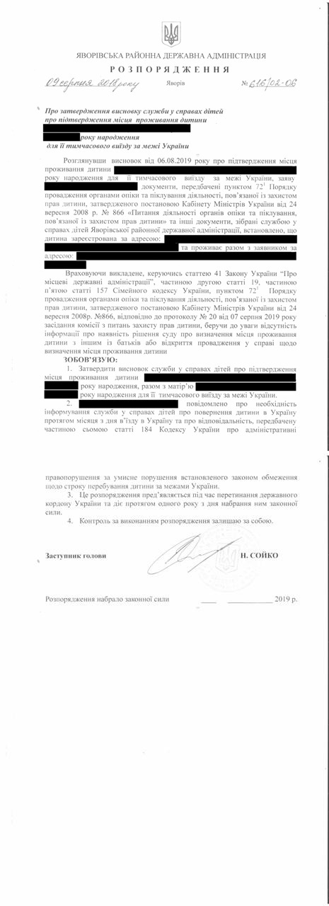 №616/02-06 2019-08-15 Про затвердження висновку служби у справах дітей про підтвердження місця проживання дитини 23.08.2012 року народження для її тимчасового виїзду за межі України (Набрав законної сили)