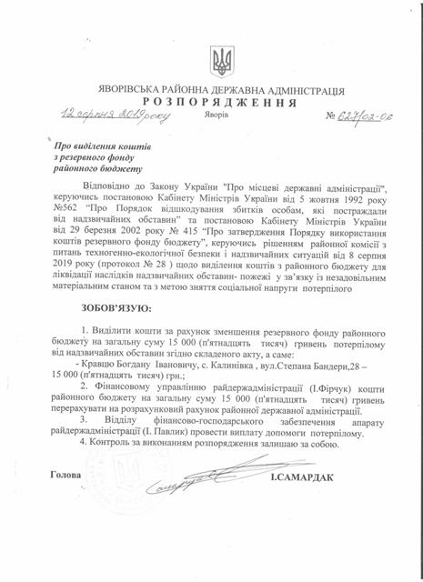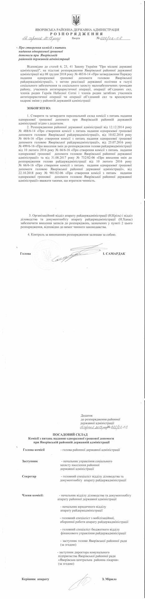 №626/02-06 2019-08-16 Про створення комісії з питань надання одноразової грошової допомоги при Яворівській районній державній адміністрації