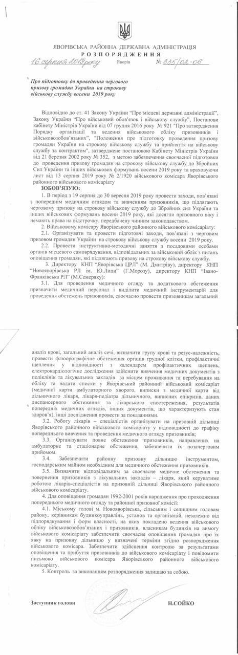 №635/02-06 2019-08-21 Про підготовку до проведення чергового призову громадян України на строкову військову службу восени 2019 року