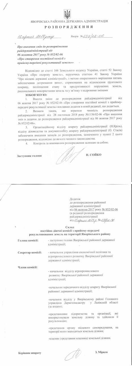 №639/02-06 2019-08-21 Про внесення змін до розпорядження райдержаадміністрації від 06 жовтня 2017 року № 852/02-06 " Про створення постійної комісії з прийому-передачі рекультивації земель"