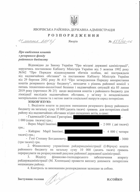 №555/02-06 2019-07-17 Про виділення коштів з резервного фонду районного бюджету