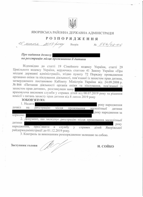 №564/02-06 2019-07-19 Про надання дозволу на реєстрацію місця проживання її дитини