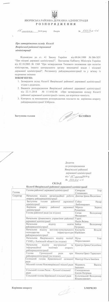 №566/02-06 2019-07-19 Про затвердження складу Колегії Яворівської районної державної адміністрації