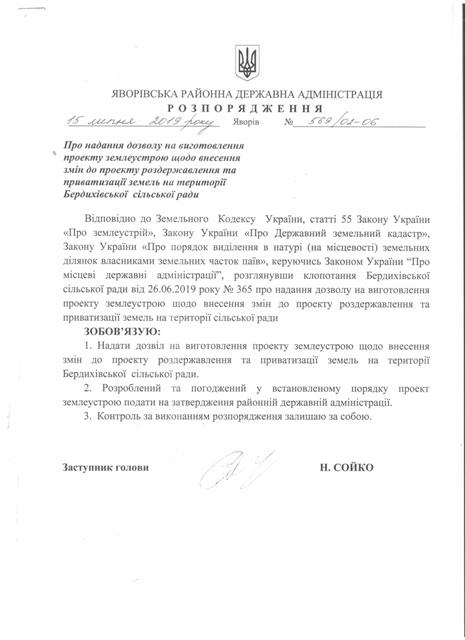 №569/02-06 2019-07-19 Про надання дозволу на виготовлення проекту землеустрою щодо внесення змін до проекту роздержавлення та приватизації земель на території Бердихівської сільської ради