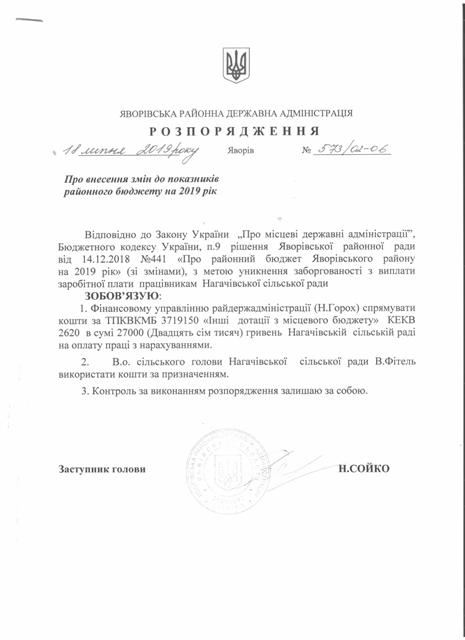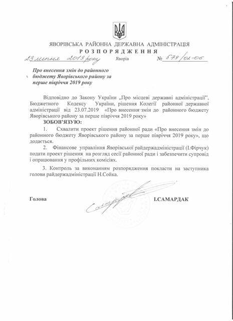 №579/02-06 2019-07-29 Про внесення змін до районного бюджету Яворівського району за перше півріччя 2019 року