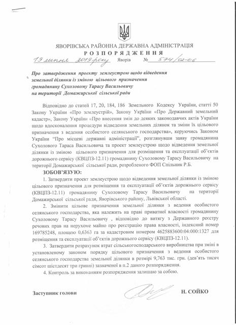 №574/02-06 2019-07-23 Про затвердження проекту землеустрою щодо відведення земельної ділянки із зміною цільового призначення громадянину Сухоловому Тарасу Васильовичу на території Домажирської сільської ради