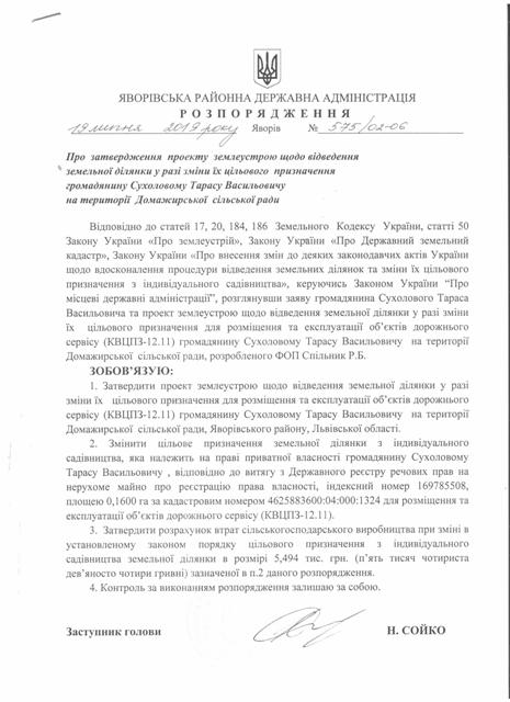 №575/02-06 2019-07-23 Про затвердження проекту землеустрою щодо відведення земельної ділянки із зміною цільового призначення громадянину Сухоловому Тарасу Васильовичу на території Домажирської сільської ради