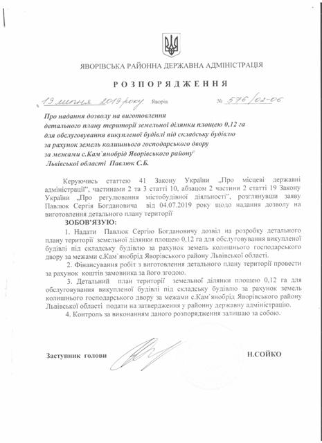 №576/02-06 2019-07-23 Про надання дозволу на виготовлення детального плану території земельної ділянки площею 0,12 га для обслуговування викупленої будівлі під складську будівлю за рахунок земель колишнього господарського двору за межами с.Кам"янобрід на території Мальчицької сільської ради Яворівського району Львівської області Павлюк С.Б.