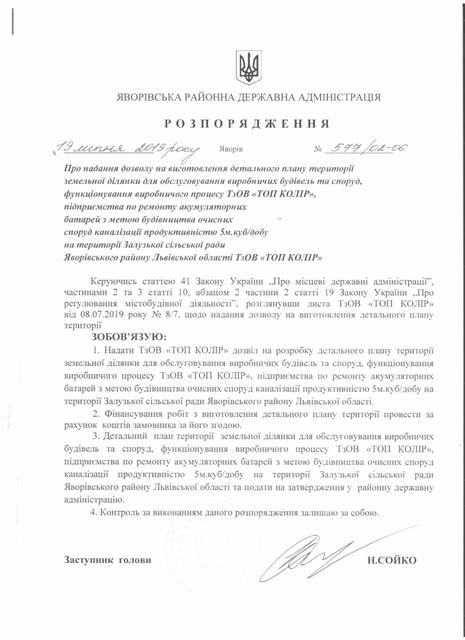 №577/02-06 2019-07-23 Про надання дозволу на виготовлення детального плану території для обслуговування виробничих будівель та \споруд , функціонування виробничого процесу ТзОВ "ТОП КОЛІР", підприємства по ремонту акумуляторних батарей з метою будівництва очисних споруд каналізації продуктивністю 5 м. куб/добу на території Залузької сільської ради Яворівського району Львівської області ТзОВ "ТОП КОЛІР"