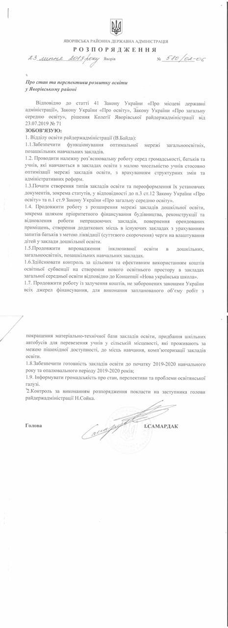 №580/02-06 2019-07-29 Про стан та перспективи розвитку освіти у Яворівському районі
