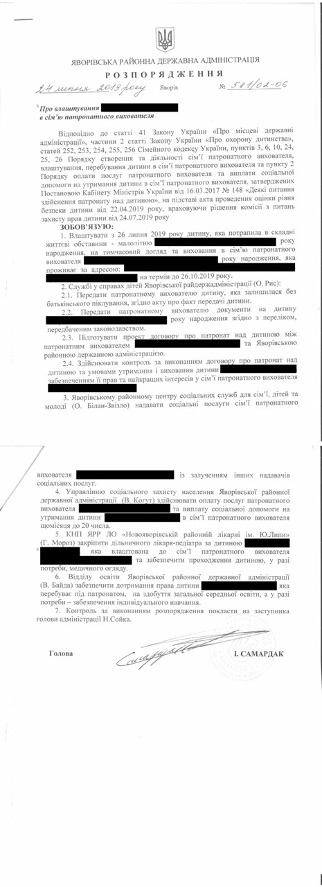 №581/02-06 2019-07-30 Про влаштування в сім"ю патронатного виховання