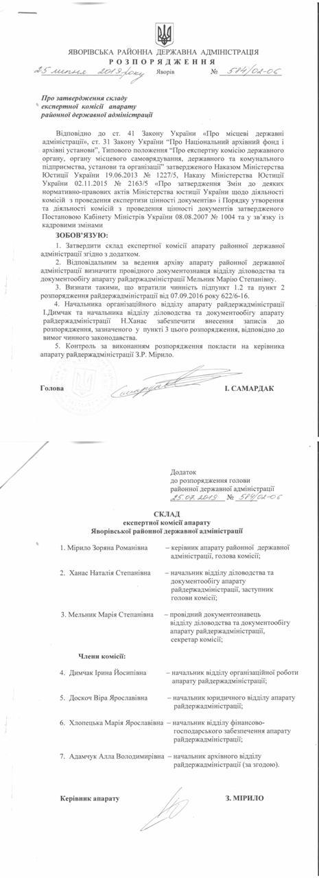 №584/02-06 2019-07-31 Про затвердження складу експертної комісії апарату районної державної адміністрації