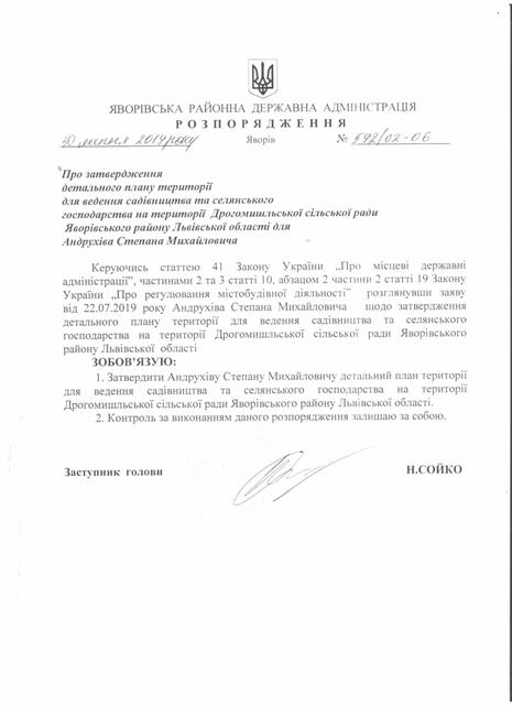 №592/02-06 2019-08-05 Про затвердження детального плану території для ведення садівництва та селянського господарства на території Дрогомишльської сільської ради Яворівського району Львівської області для Андрухіва Степана Михайловича