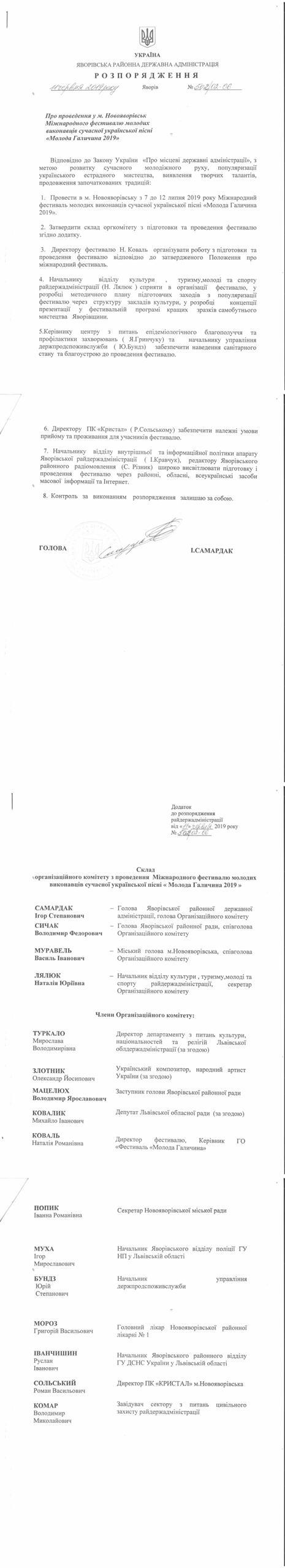 №502/02-06 2019-06-14 Про проведення у м. Новояворівськ Міжнародного фестивалю молодих виконавців сучасної української пісні "Молода Галичина 2019"