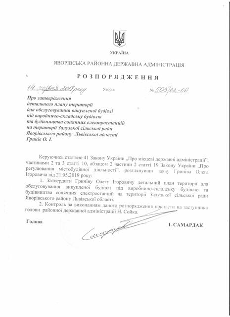 №505/02-06 2019-06-18 Про затвердження детального плану території для обслуговування викупленої будівлі під виробничо-складську будівлю та будівництва сонячних електростанцій на території Залузької сільської ради Яворівського району Львівської області Гринів О.І.