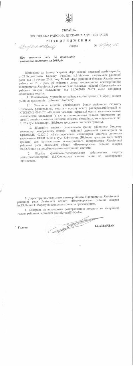 №509/02-06 2019-06-20 Про внесення змін до показників районного бюджету на 2019 рік