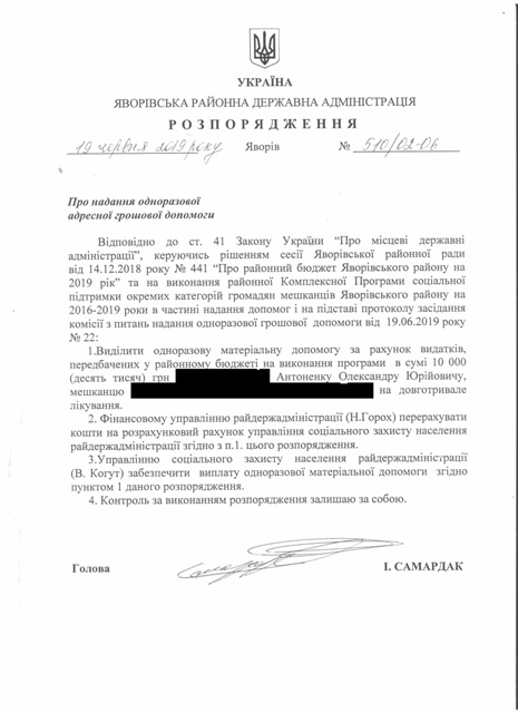 №510/02-06 2019-06-25 Про надання одноразової адресної грошової допомоги