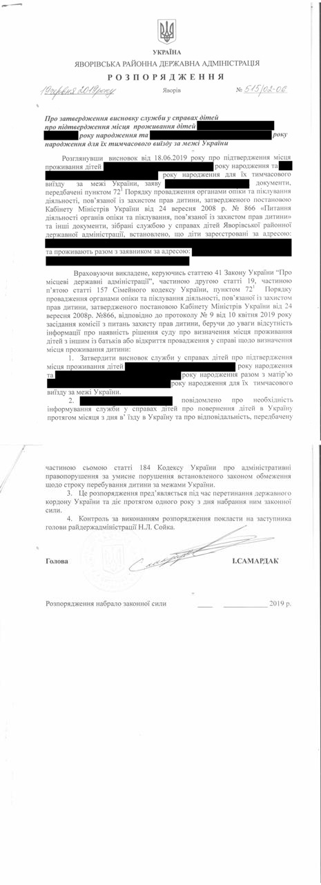 №515/02-06 2019-06-25 Про затвердження висновку служби у справах дітей про підтвердження місця проживання дітей для їх тимчасового виїзду за межі України (Набрало законної сили)