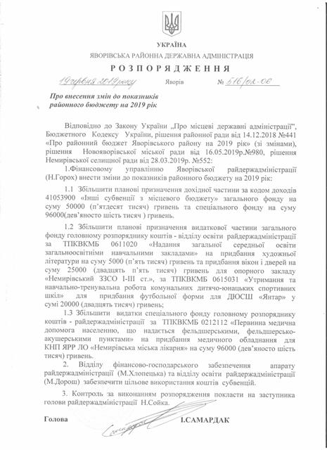 №516/02-06 2019-06-25 Про внесення змін до показників районного бюджету на 2019 рік