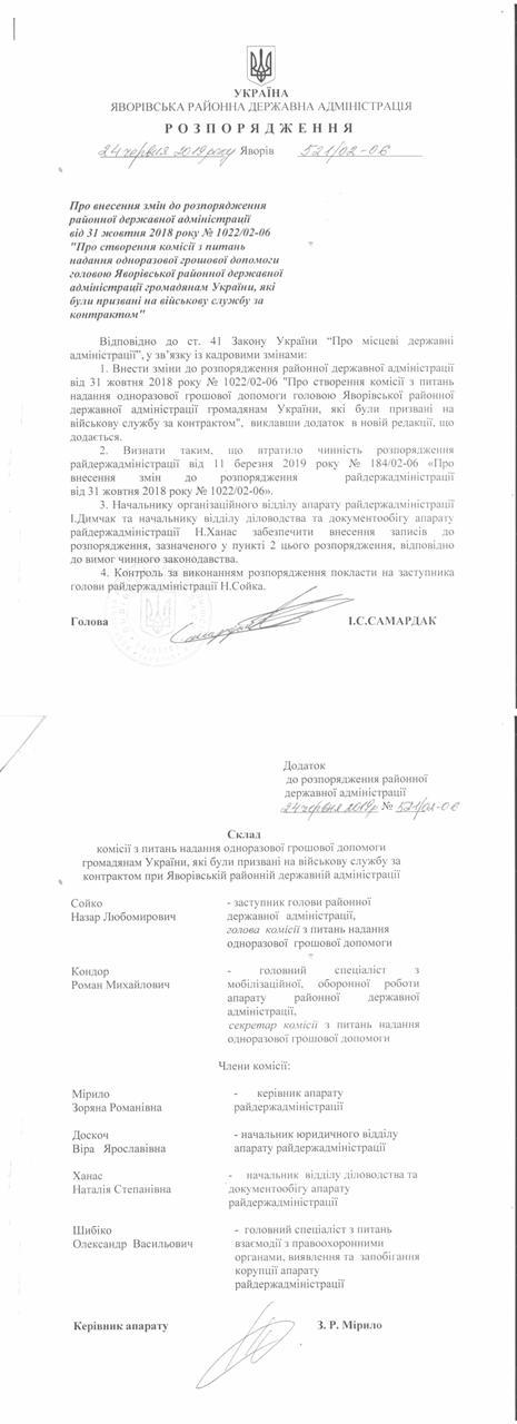 №521/02-06 2019-06-27 Про внесення змін до розпорядження районної державної адміністрації від 31 жовтня 2018 № 1022/02-06 " Про створення комісії з питань надання одноразової грошової допомоги головою Яворівської районної державної адміністрації громадянам України, які були призвані на військову службу за контрактом"