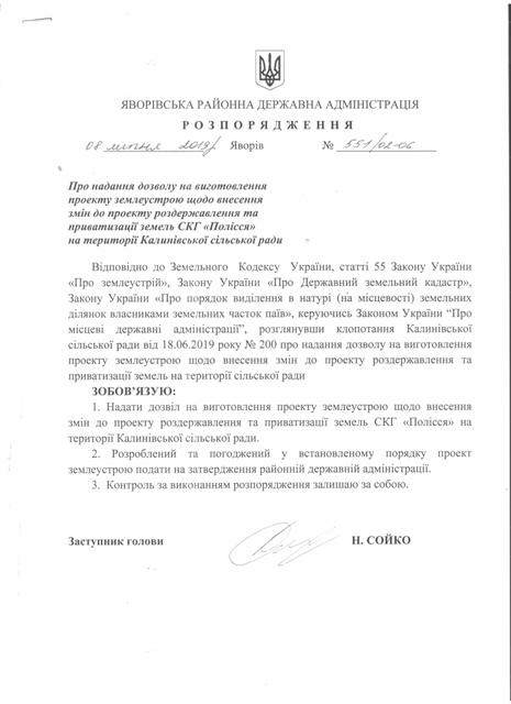 №551/02-06 2019-07-12 Про надання дозволу на виготовлення проекту землеустрою щодо внесення змін до проекту роздержавлення та приватизації земель СКГ "Полісся" на території Калинівської сільської ради