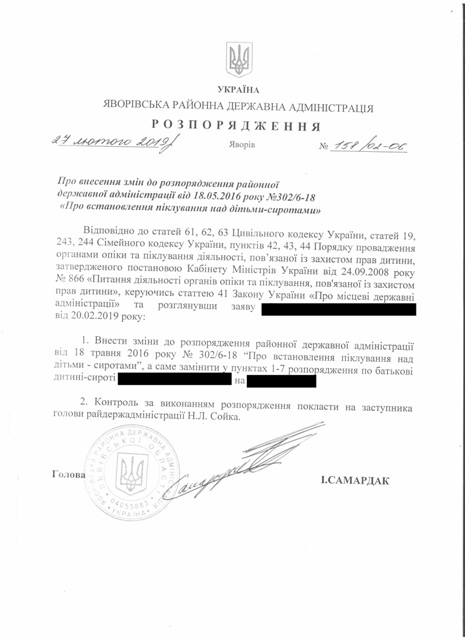 №158/02-06 2019-03-04 Про внесення змін до розпорядження районної державної адміністрації від 18.05.2016 року № 302/6-18 " Про встановлення піклування над дітьми-сиротами"