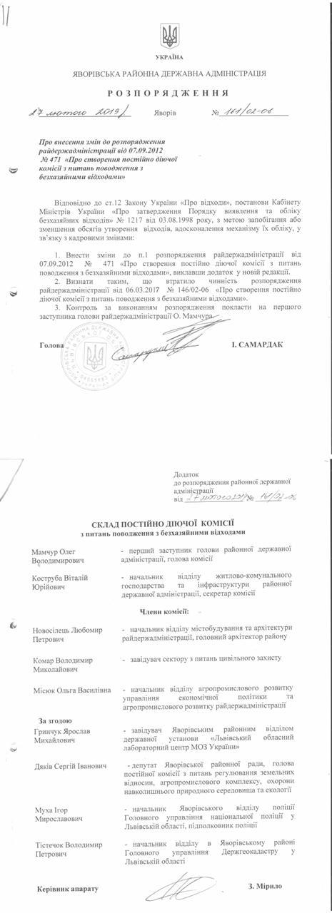 №161/02-06 2019-03-04 Про внесення змін до розпорядження райдержадміністрації від 07.09.2012 №471 " Про створення постійно діючої комісії з питань поводження з безхазяйними відходами" ( Втратило чинність)