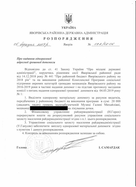 №172/02-06 2019-03-12 Про надання одноразової адресної грошової допомоги