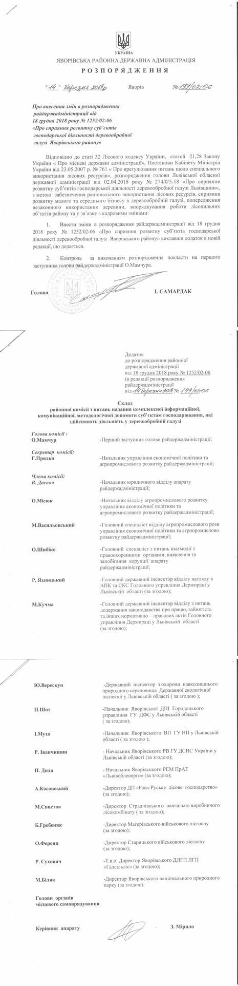 №199/02-06 2019-03-19 Про внесення змін до розпорядження райдержадміністрації від 18 грудня 2018 року № 1252/02-16 "Про сприяння розвитку суб"єктів господарської діяльності деревообробної галузі Яворівського району"