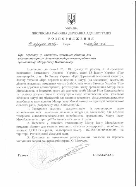 №200/02-06 2019-03-19 Про передачу у власність земельної ділянки для ведення товарного сільськогосподарського виробництва громадянину Мазур Івану Михайловичу