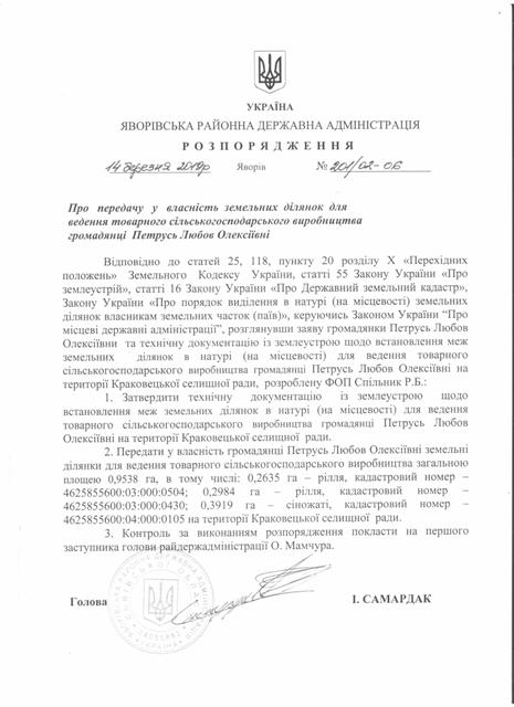 №201/02-06 2019-03-19 Про передачу у власність земельних ділянок для ведення товарного сільськогосподарського виробництва громадянці Петрусь Любов Олексіївні