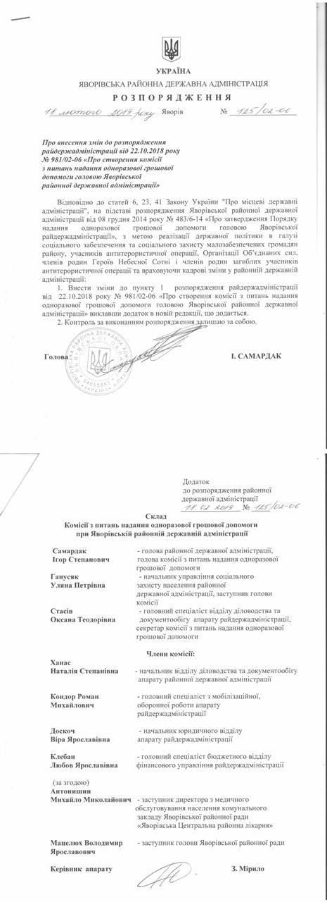 №125/02-06 2019-02-21 Про внесення змін до розпорядження райдержадміністрації від 22.10.2018 року № 981/02-06 " Про створення комісії з питань надання одноразової грошової допомоги головою Яворівської районної державної адміністрації"