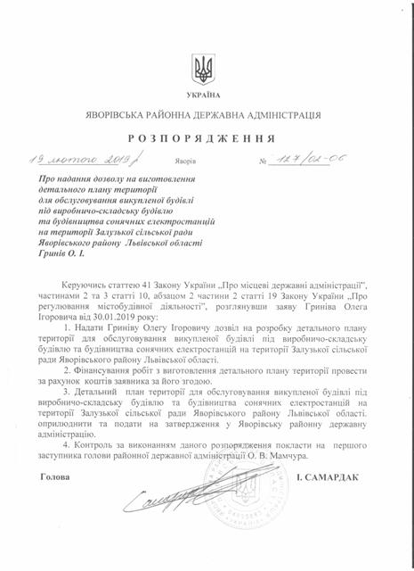 №127/02-06 2019-02-22 Про надання дозволу на виготовлення детального плану території для обслуговування викупленої будівлі під виробничо-складську будівлю та будівництво сонячних електростанцій на території Залузької сільської ради Яворівського району Львівської області Гринів О.І.