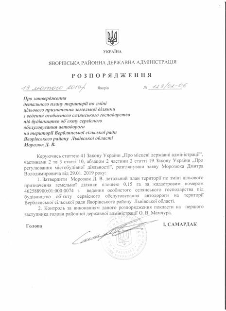 №129/02-06 2019-02-22 Про затвердження детального плану території по зміні цільового призначення земельної ділянки з ведення особистого селянського господарства під будівництво об"єкту сервісного обслуговування автодороги на території Верблянської сільської ради Яворівського району Львівської області Морозюк Д.В.