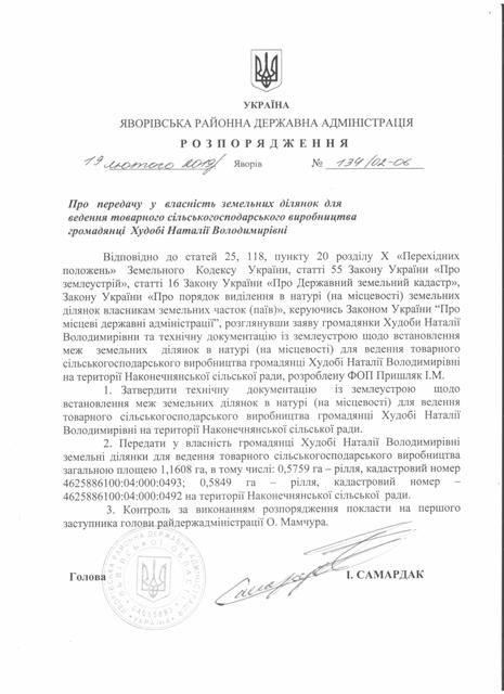 №134/02-06 2019-02-22 Про передачу у власність земельних ділянок для ведення товарного сільськогосподарського виробництва громадянці Худобі Наталії Володимирівні