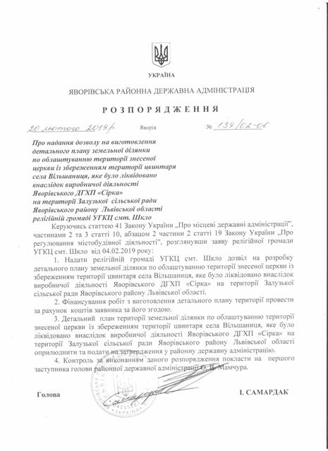 №139/02-06 2019-02-25 Про надання дозволу на виготовлення детального плану земельної ділянки по облаштуванню території знесеної церкви із збереженням території цвинтаря села Вільшаниця,яке було ліквідовано внаслідок виробничої діяльності Яворівського ДГХП"Сірка" на території Залузької сільської ради Яворівського району Львівської області релігійній горомаді УГКЦ смт Шкло