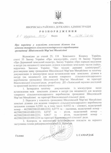 №1298/02-06 2018-12-27 Про передачу у власність земельних ділянок для ведення товарного сільськогосподарського виробництва громадянці Шидловській Мар"яні Михайлівні