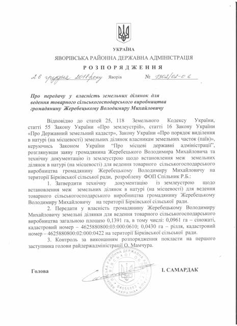 №1302/02-06 2018-12-27 Про передачу у власність земельних ділянок для ведення товарного сільськогосподарського виробництва громадянину Жеребецькому Володимиру Михайловичу