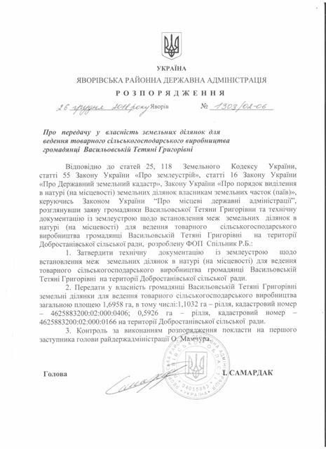 №1303/02-06 2018-12-27 Про передачу у власність земельних ділянок для ведення товарного сільськогосподарського виробництва громадянці Васильовській Тетяні Григорівні