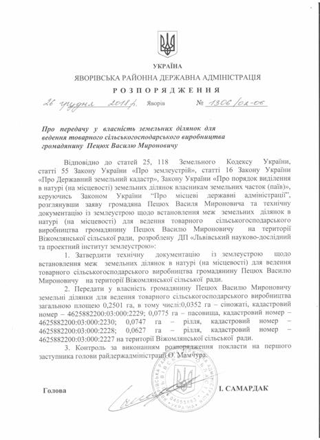 №1306/02-06 2018-12-27 Про передачу у власність земельних ділянок для ведення товарного сільськогосподарського виробництва громадянину Пецюх Василю Мироновичу