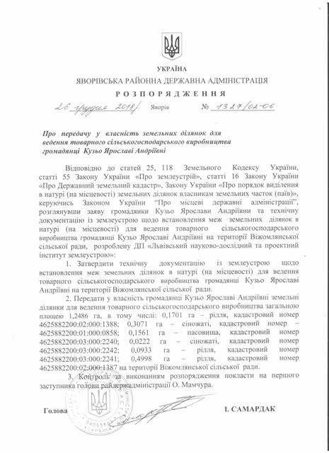 №1327/02-06 2018-12-29 Про передачу у власність земельних ділянок для ведення товарного сільськогосподарського виробництва громадянці Кузьо Ярославі Андріївні
