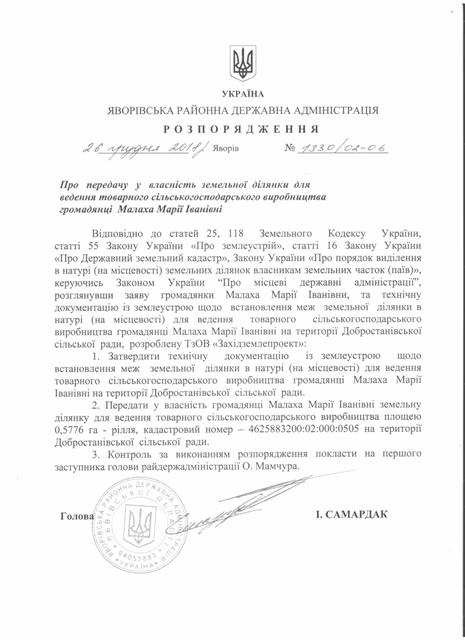 №1330/02-06 2018-12-29 Про передачу у власність земельної ділянки для ведення товарного сільськогосподарського виробництва громадянці Малаха Марії Іванівні