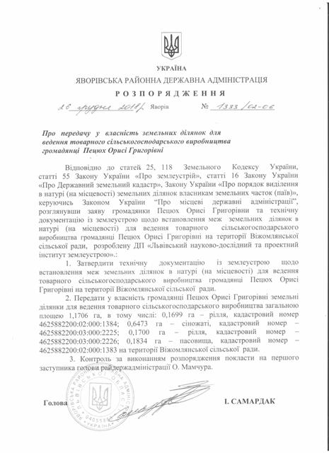 №1333/02-06 2018-12-29 Про передачу у власність земельних ділянок для ведення товарного сільськогосподарського виробництва громадянці Пецюх Орисі Григорівні