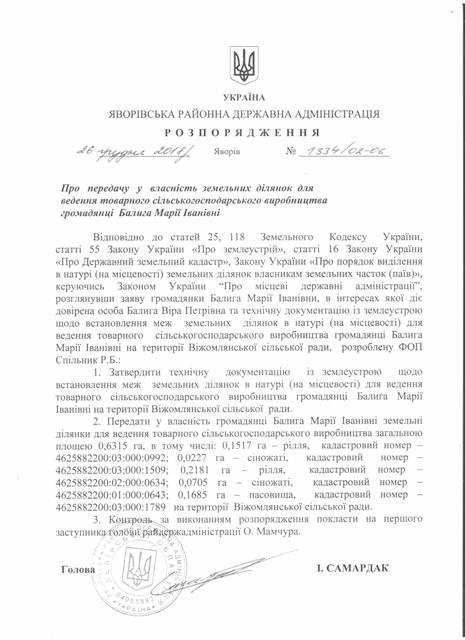 №1334/02-06 2018-12-29 Про передачу у власність земельних ділянок для ведення товарного сільськогосподарського виробництва громадянці Балига Марії Іванівні