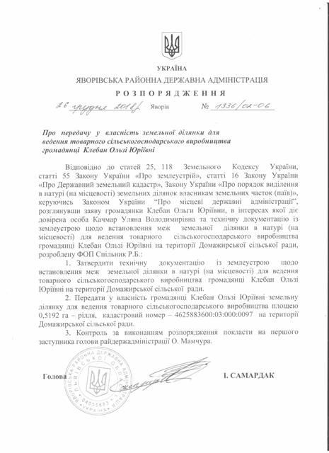 №1336/02-06 2018-12-29 Про передачу у власність земельної ділянки для ведення товарного сільськогосподарського виробництва громадянці Клебан Ользі Юріївні