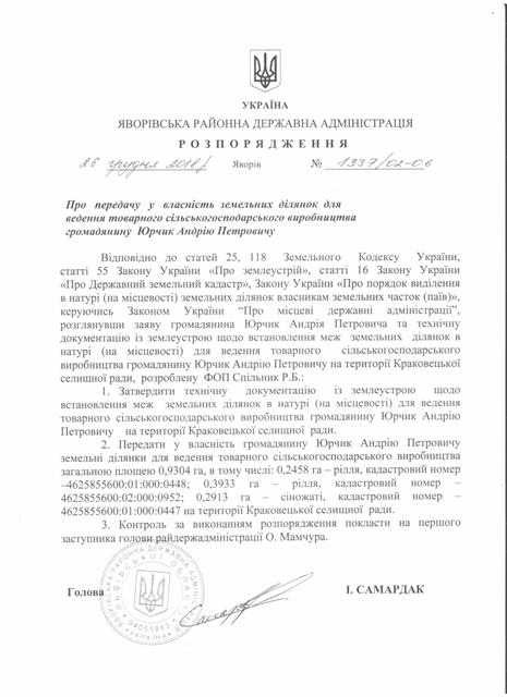 №1337/02-06 2018-12-29 Про передачу у власність земельних ділянок для ведення товарного сільськогосподарського виробництва громадянину Юрчик Андрію Петровичу
