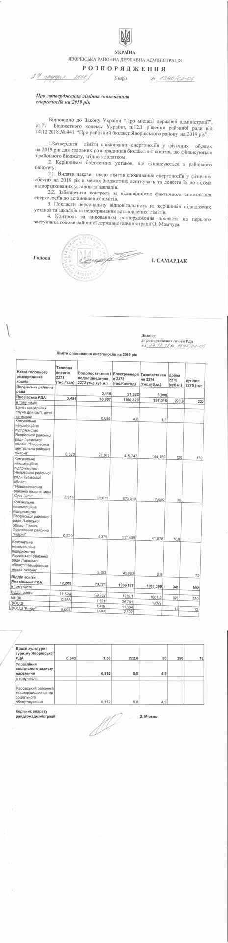 №1340/02-06 2018-12-29 Про затвердження лімітів споживання енергоносіїв на 2019 рік